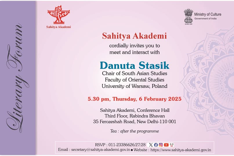 - 2–13.02.2025 r. prof. Danuta Stasik odbyła wizytę w Indiach w ramach programu Distinguished Academic Visitors Programme, na zaproszenie Indian Council for Cultural Relations. W trakcie pobytu wygłosiła wykłady na Uniwersytecie Delhijskim, Jawaharlal Nehru University oraz Indira Gandhi National Open University w Delhi, a także na Uniwersytecie w Allahabadzie (Prayagraj), oraz prelekcję w indyjskiej Akademii Literatury w New Delhi.